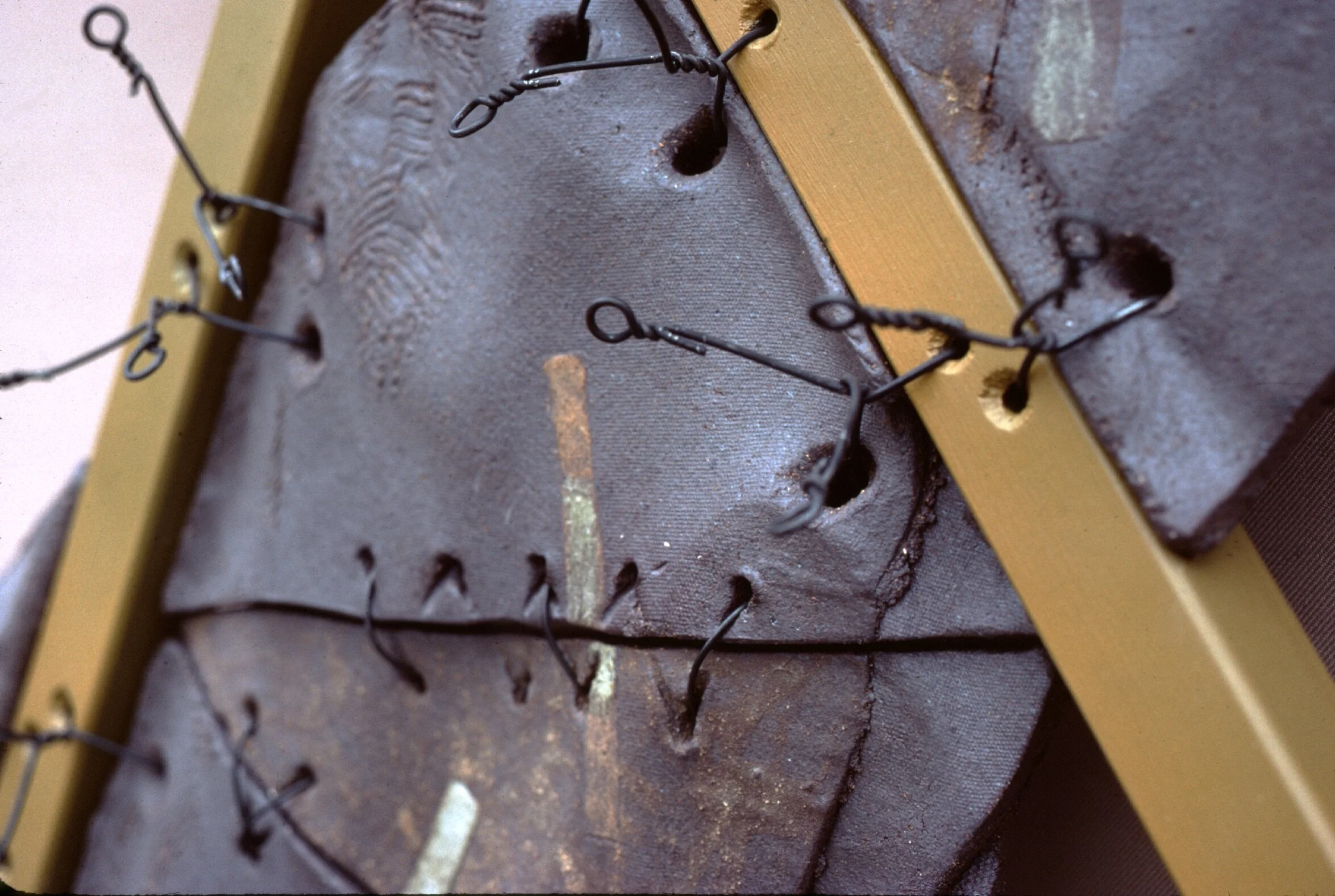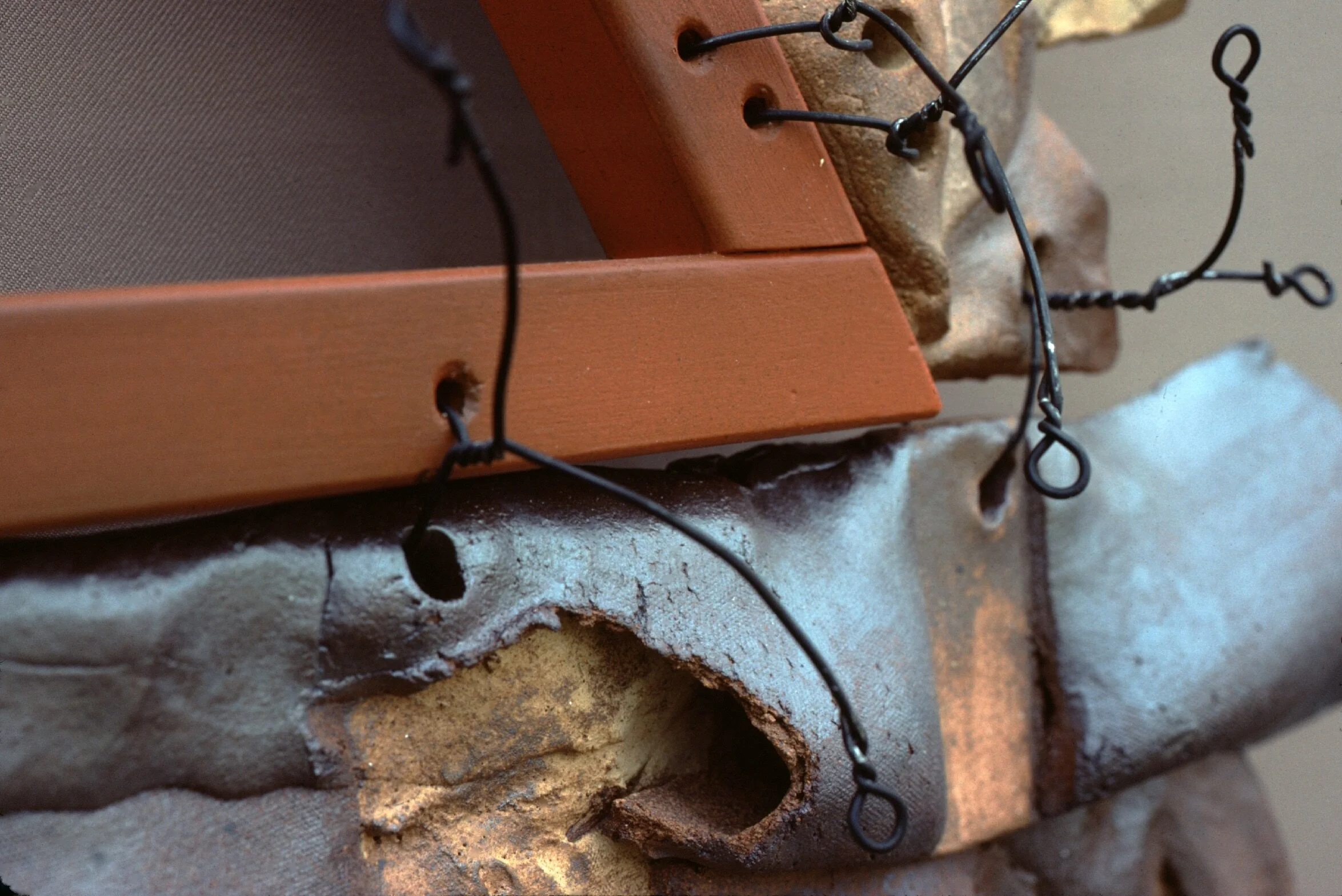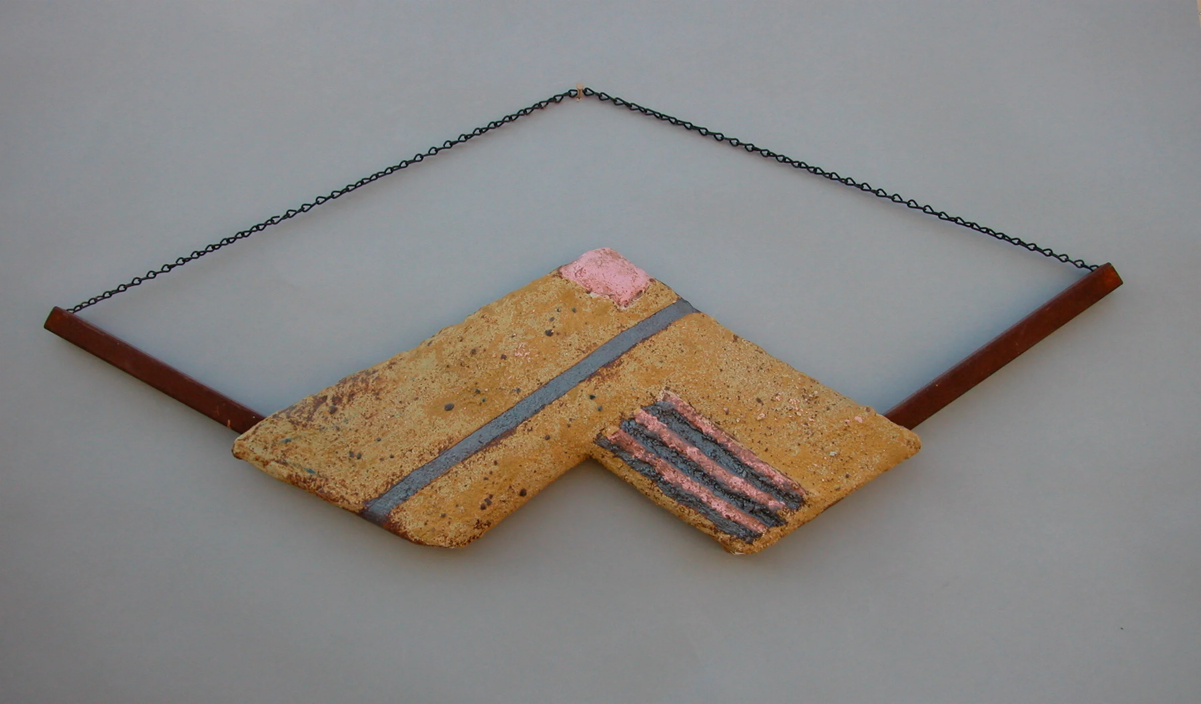 Triangular Introspection. 47" x 36" x 6.5”. 1979. Stoneware, bailing wire, and wood.